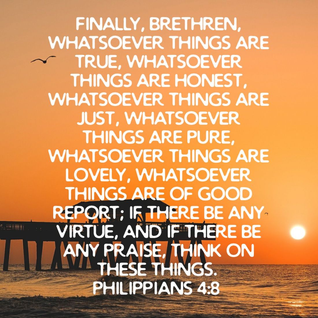 Finally, brethren, whatsoever things are true, whatsoever things are honest, whatsoever things are just, whatsoever things are pure, whatsoever things are lovely, whatsoever things are of good report; if there be any virtue, and if there be any praise, think on these things.