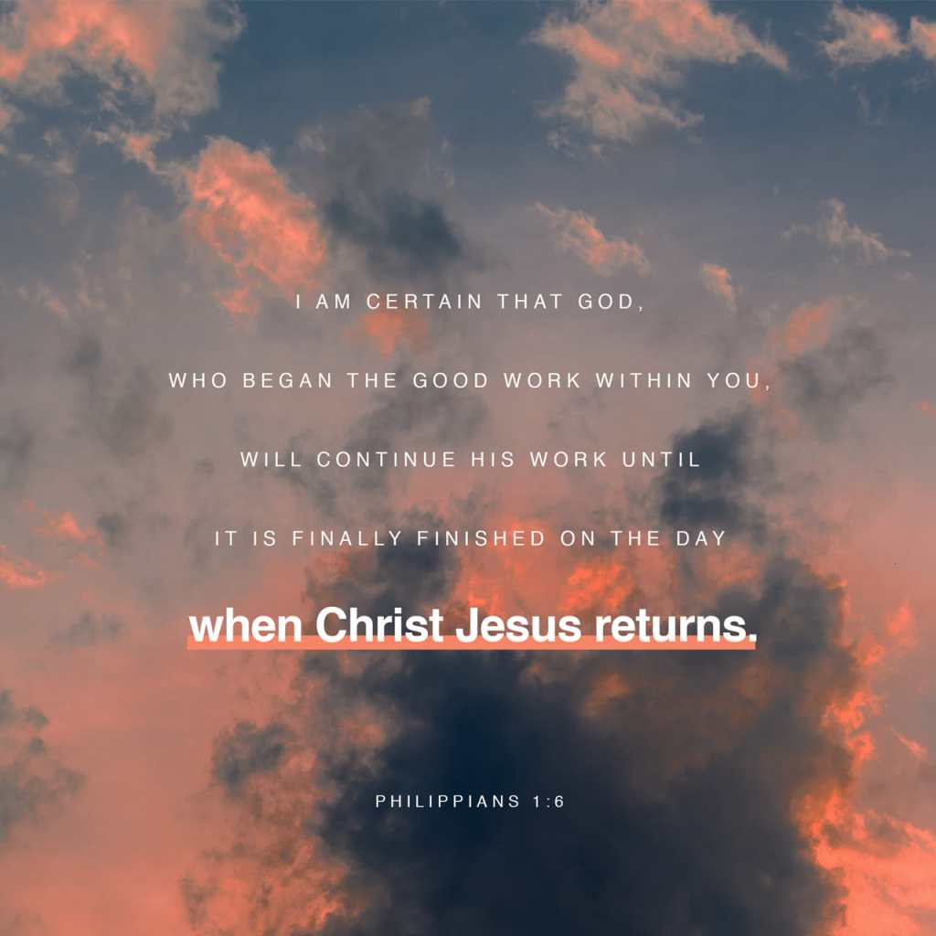 Being confident of this very thing, that he which hath begun a good work in you will perform it until the day of Jesus Christ: Philippians 1:6 KJV https://bible.com/bible/1/php.1.6.KJV