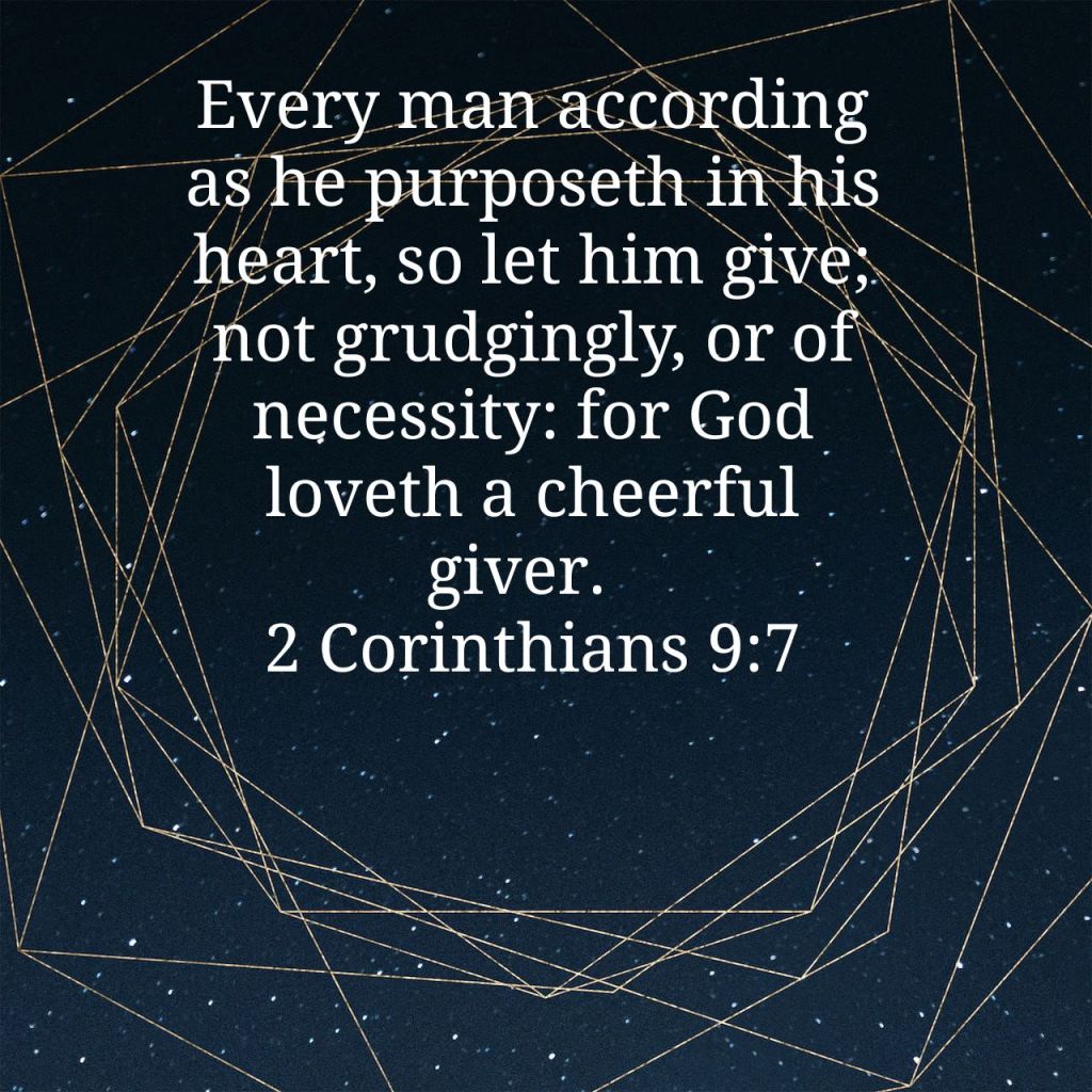 Every man according as he purposeth in his heart, so let him give; not grudgingly, or of necessity: for God loveth a cheerful giver. 2 Corinthians 9:7 KJV https://bible.com/bible/1/2co.9.7.KJV