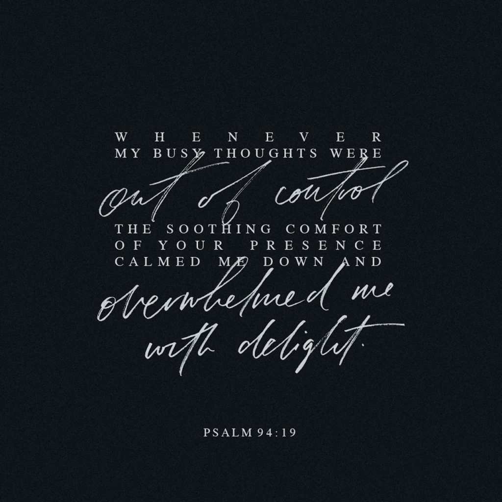 In the multitude of my thoughts within me thy comforts delight my soul. Psalms 94:19 KJV https://bible.com/verse-of-the-day/psa.94.19/31337