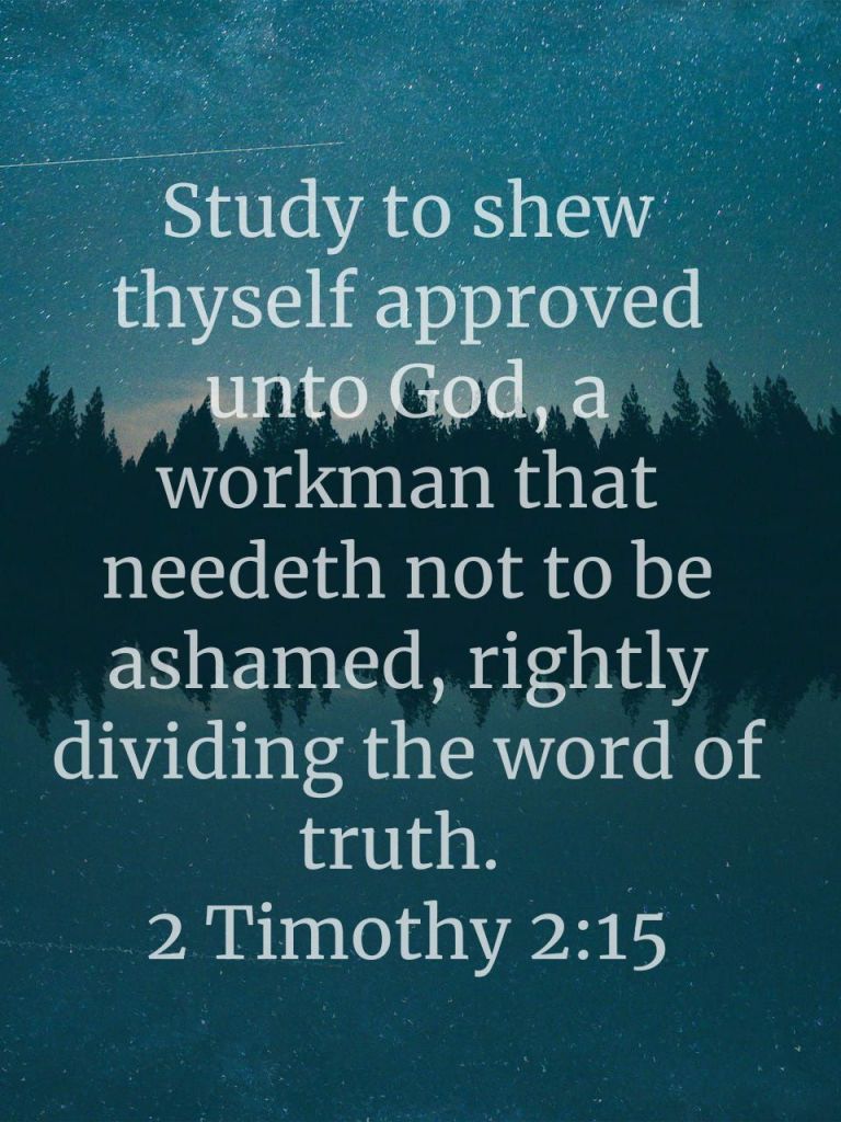 Study to shew thyself approved unto God, a workman that needeth not to be ashamed, rightly dividing the word of truth. 2 Timothy 2:15 KJV https://bible.com/bible/1/2ti.2.15.KJV