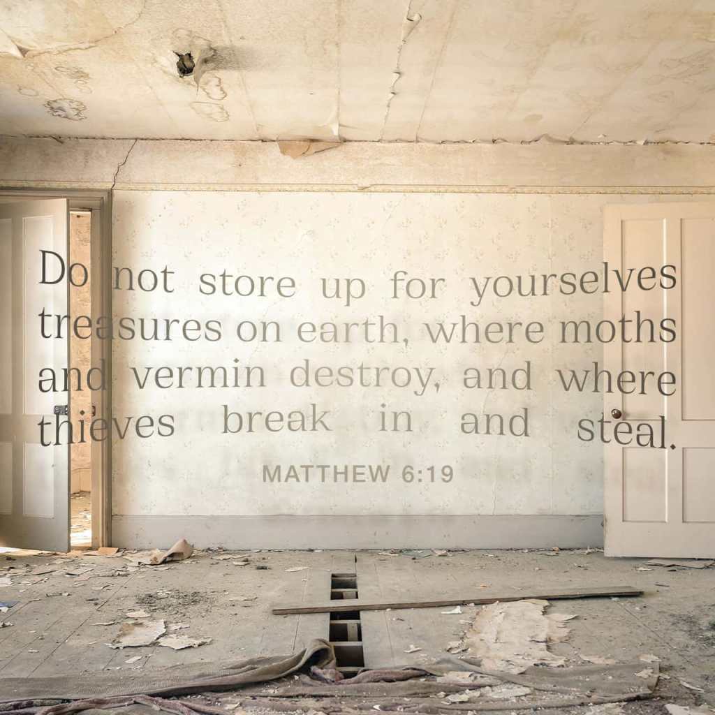 Lay not up for yourselves treasures upon earth, where moth and rust doth corrupt, and where thieves break through and steal: Matthew 6:19 KJV https://bible.com/bible/1/mat.6.19.KJV