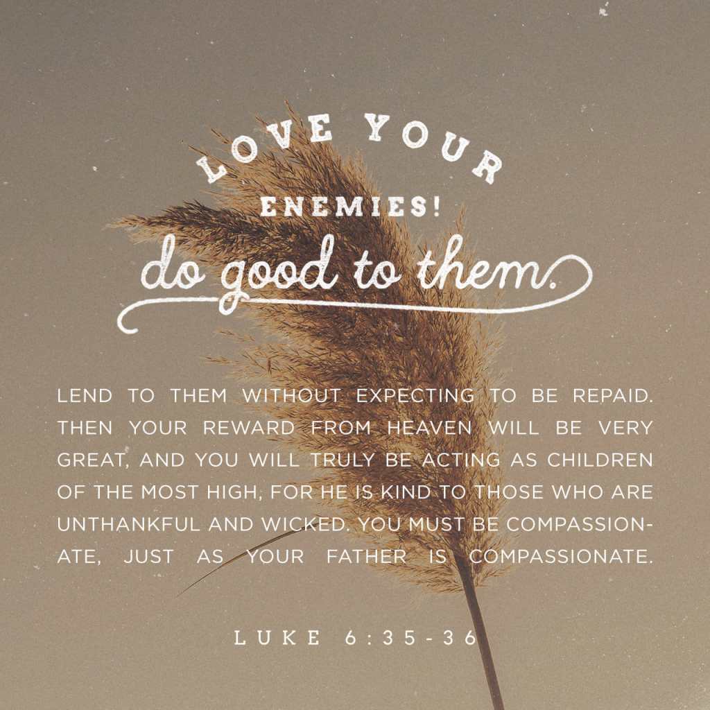 35 But love ye your enemies, and do good, and lend, hoping for nothing again; and your reward shall be great, and ye shall be the children of the Highest: for he is kind unto the unthankful and to the evil. Luke 6:35 KJV https://bible.com/bible/1/luk.6.35.KJV