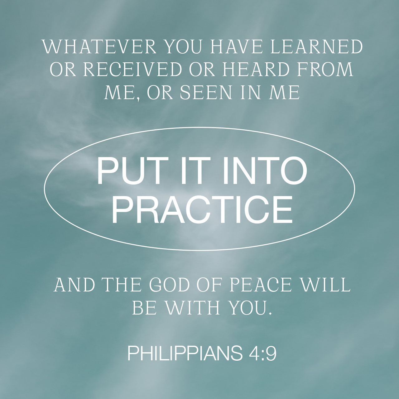 Those things, which ye have both learned, and received, and heard, and seen in me, do: and the God of peace shall be with you. Philippians 4:9 KJV https://bible.com/verse-of-the-day/php.4.9/60144