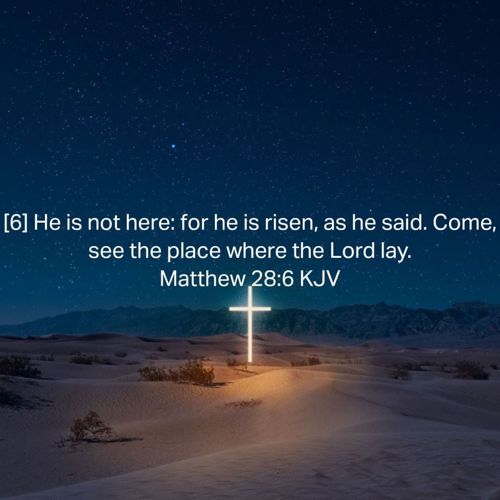 Matthew 28:6 KJV [6] He is not here: for he is risen, as he said. Come, see the place where the Lord lay. https://bible.com/bible/1/mat.28.6.KJV