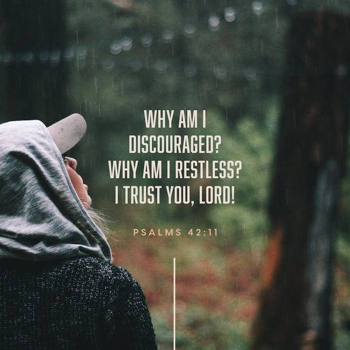 Psalms 42:11 NIV [11] Why, my soul, are you downcast? Why so disturbed within me? Put your hope in God, for I will yet praise him, my Savior and my God. https://bible.com/bible/111/psa.42.11.NIV