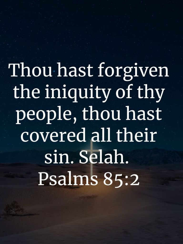 Thou hast forgiven the iniquity of thy people, thou hast covered all their sin. Selah. Psalms 85:2 KJV https://bible.com/bible/1/psa.85.2.KJV